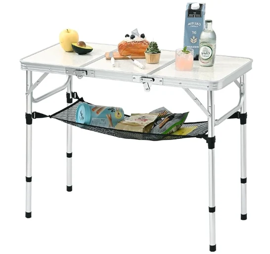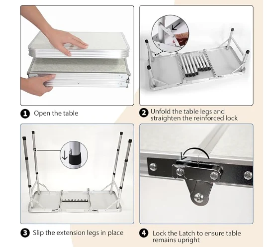 పోర్టబుల్ అల్యూమినియం క్యాంపింగ్ టేబుల్, తేలికైన మరియు పోర్టబుల్: ఇది సులభంగా రవాణా చేయడానికి క్యారీ హ్యాండిల్తో వస్తుంది. మీ కారులో అనుకూలమైన నిల్వ కోసం దీనిని కాంపాక్ట్ బ్రీఫ్కేస్ పరిమాణంగా మడవవచ్చు. 7 ఎల్బి బరువుతో, ఈ పోర్టబుల్ పట్టిక 80 ఎల్బిల వరకు ఉంటుంది