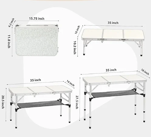 3 అడుగుల మడత పట్టిక: 35 అంగుళాల x16 అంగుళాల x 27.5 అంగుళాల పూర్తి పరిమాణ కొలతలతో, మరియు 16 అంగుళాల x 12 అంగుళాల x 4.2 అంగుళాల ముడుచుకున్న కొలతలు